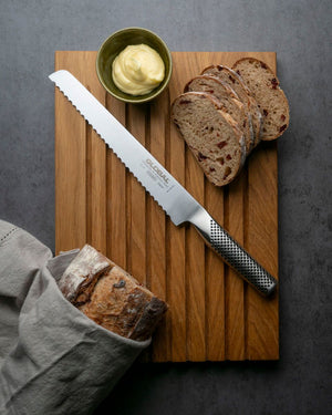 A large 8.5" serrated bread knife that's great for slicing foods with thick crusts or rinds like artisan breads and melons/gourds. It also cuts through soft bread without crushing it.