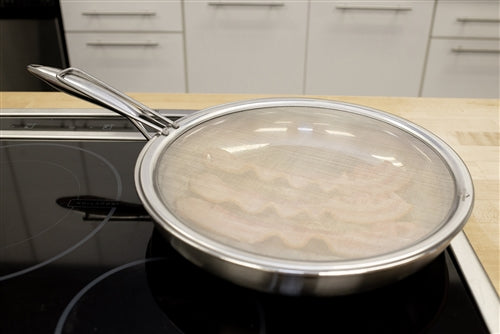 This 13" splatter guard is a high-quality stainless steel screen designed to sit over frying pans and skillets, capturing grease and oil spray while still allowing steam to escape through its fine mesh. With a smooth, durable finish and sturdy handle, it helps keep stovetops and surrounding surfaces cleaner during high-heat cooking, and is fully dishwasher safe for easy cleanup.