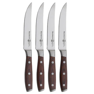 The Avanta 4 Piece Pakkawood Fine Edge Stainless Steak Knives are crafted from X50 German steel for knives that are sharp, rust resistant, and easy to maintain. Solid bolsters and full tang construction give the knives great balance and heft. The 5” blades have fine cutting edges with curved tips to easily slice through steak. Avanta Steak Knives are made with a beautiful triple-rivet pakkawood handle.