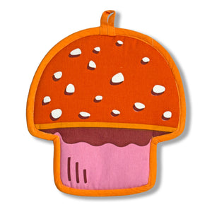 This playfully shaped pot holder is a fun, durable kitchen essential for safely handling hot cookware. Made with a 100% cotton outer layer, it features artwork on both sides, a built-in pocket for heat protection and grip, and a hanging loop for easy storage or display.