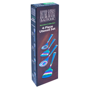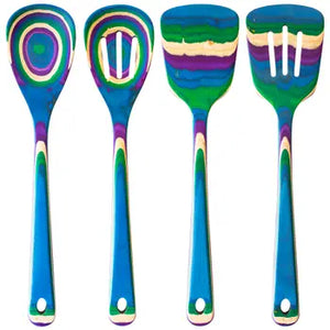 This 4 piece set includes the most popular utensils in the Baltique® Mumbai Collection; a slotted mixing spoon, mixing spoon, slotted spatula and spatula. You'll love the bright bursts of color they add to any kitchen and dining table.