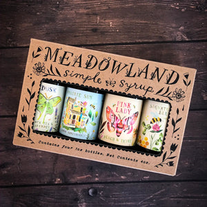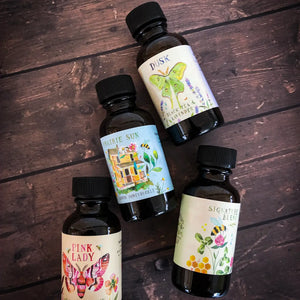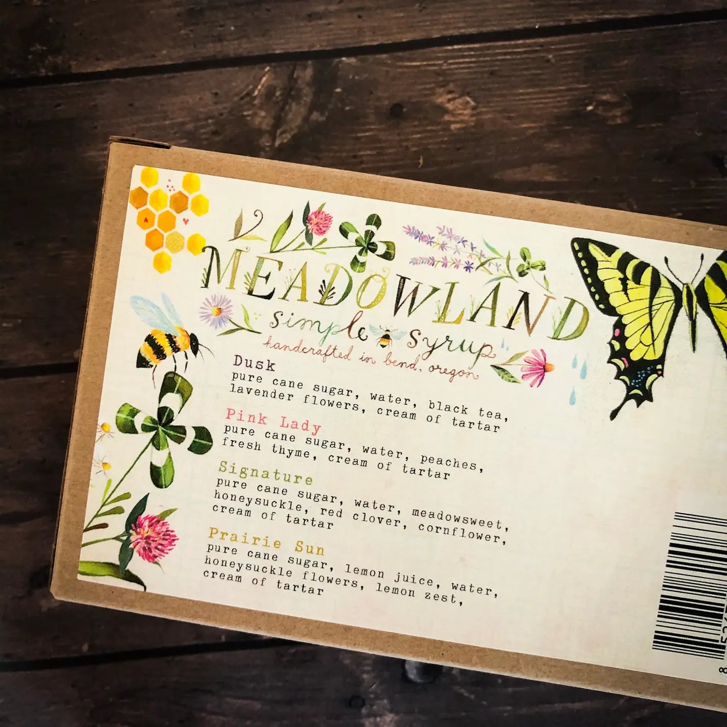 A whimsical collection of 4 of our favorite simple syrups! Perfect in your cocktails, lemonade, sparkling water, or even baked goods! :) In this kit, you'll receive four-1 oz bottles of the following: Pink Lady: summer sun, garden strolls, a fresh peach. Prairie Sun: Sun-soaked prairie flowers, tart lemon, summer haze. Dusk: Lavender flowers, purple skies, rich black tea, warm summer evenings, mystery. Signature Blend: Meadow flowers, afternoon sun, bee pollen, nostalgia, light rain.